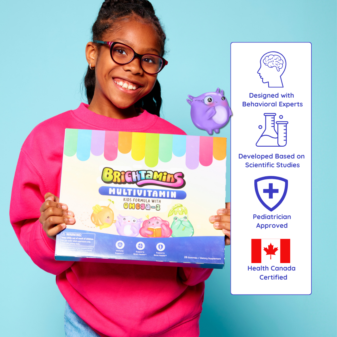 Unlike traditional vitamins, Brightamins gets kids excited about health routines through fun, educational and engaging content and characters. We pair this with high quality, expert formulated, junk-free gummies to give both kids and parents something to feel good about.